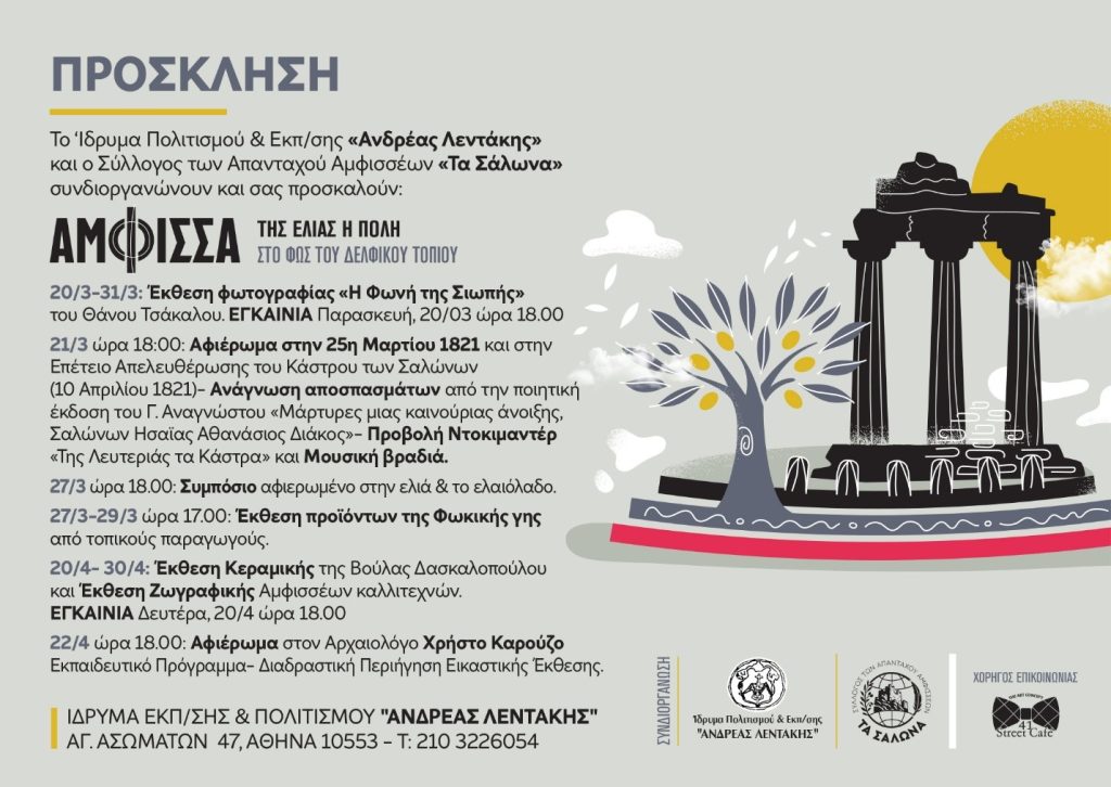 Το τρίτο δεκαήμερο του Μαρτίου, ο Σύλλογος των Απανταχού Αμφισσέων «Τα Σάλωνα» διοργάνωσε σε συνεργασία με το Ίδρυμα Πολιτισμού & Εκπαίδευσης «Ανδρέας Λεντάκης» σειρά δράσεων και εκδηλώσεων με θέμα «Άμφισσα της Ελιάς. Η πόλη στο Φως του Δελφικού Τοπίου».