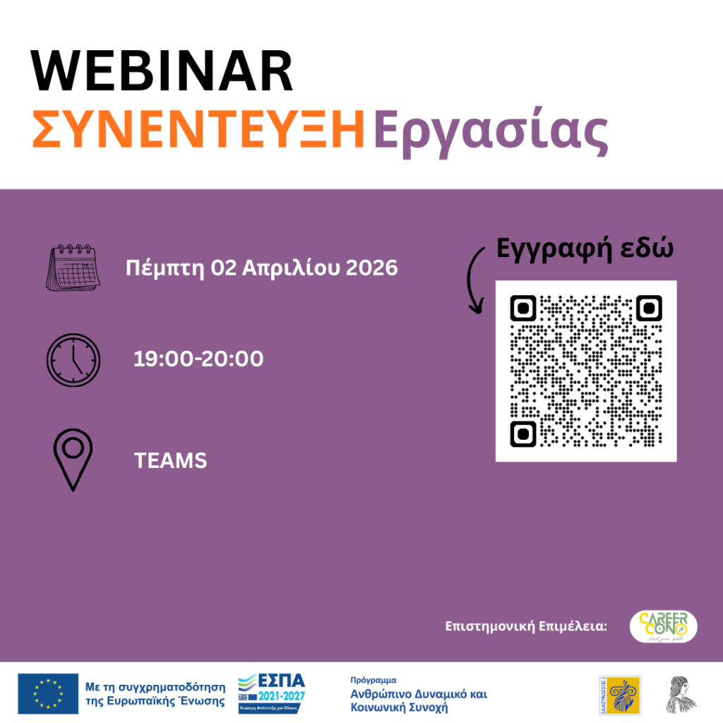 Το Γραφείο Διασύνδεσης (Γ.Δ.) του Γεωπονικού Πανεπιστημίου Αθηνών, υπό την επιστημονική επιμέλεια της CareerCon, διοργανώνει διαδικτυακό σεμινάριο σχετικά με τη Προετοιμασία για τη Συνέντευξη Εργασίας, το οποίο θα πραγματοποιηθεί: